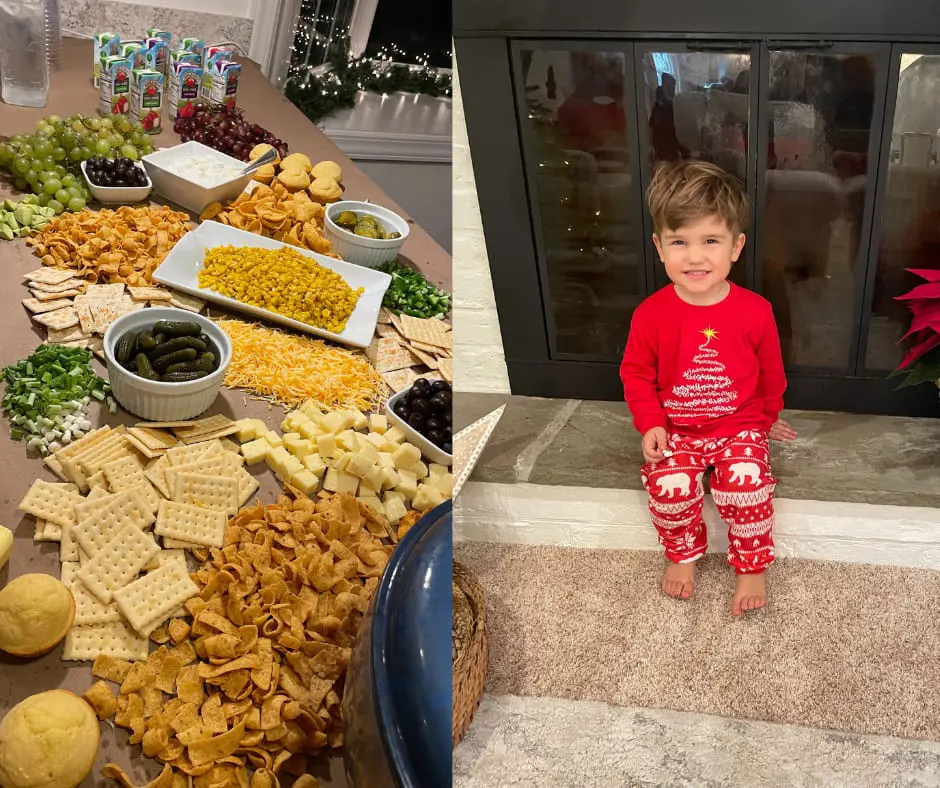 Traditionally, we have a new pair of Christmas pajamas for each one that makes a great picture…after we get everyone settled! Lol! Following pictures, we began the evening with a chili bar I made. It was a big hit this year, all but my homemade cornbread muffins that they were not a fan of. You never know! Hahaha!